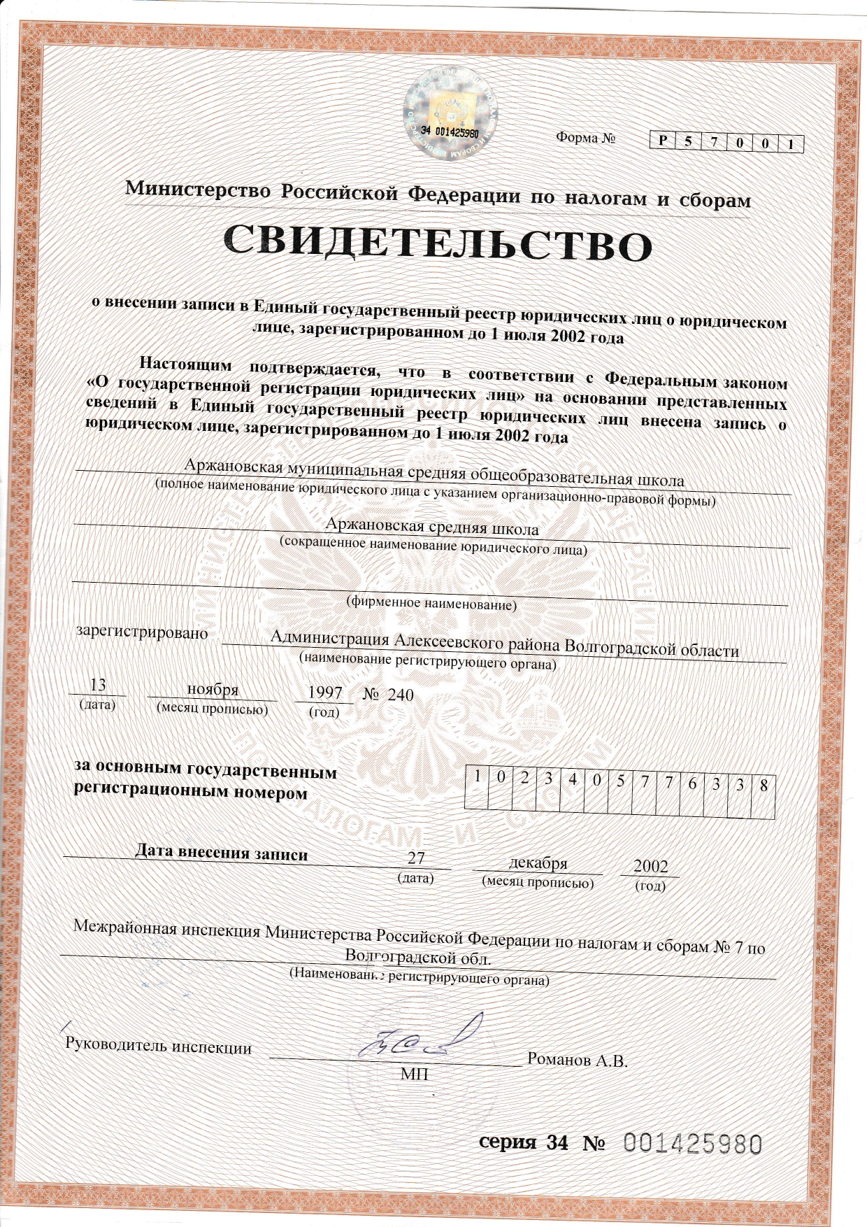 Свидетельство Федеральной налоговой службы